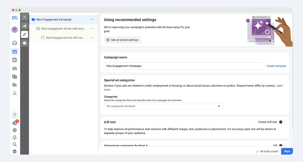 目标: 选择“互动次数 (Engagement)”,随后选择“手动设置互动广告系列”(Manual sales campaign)。