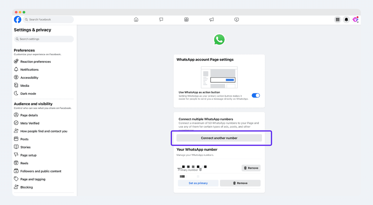 步骤一:将 WhatsApp 账户连接到您的 Facebook 页面
