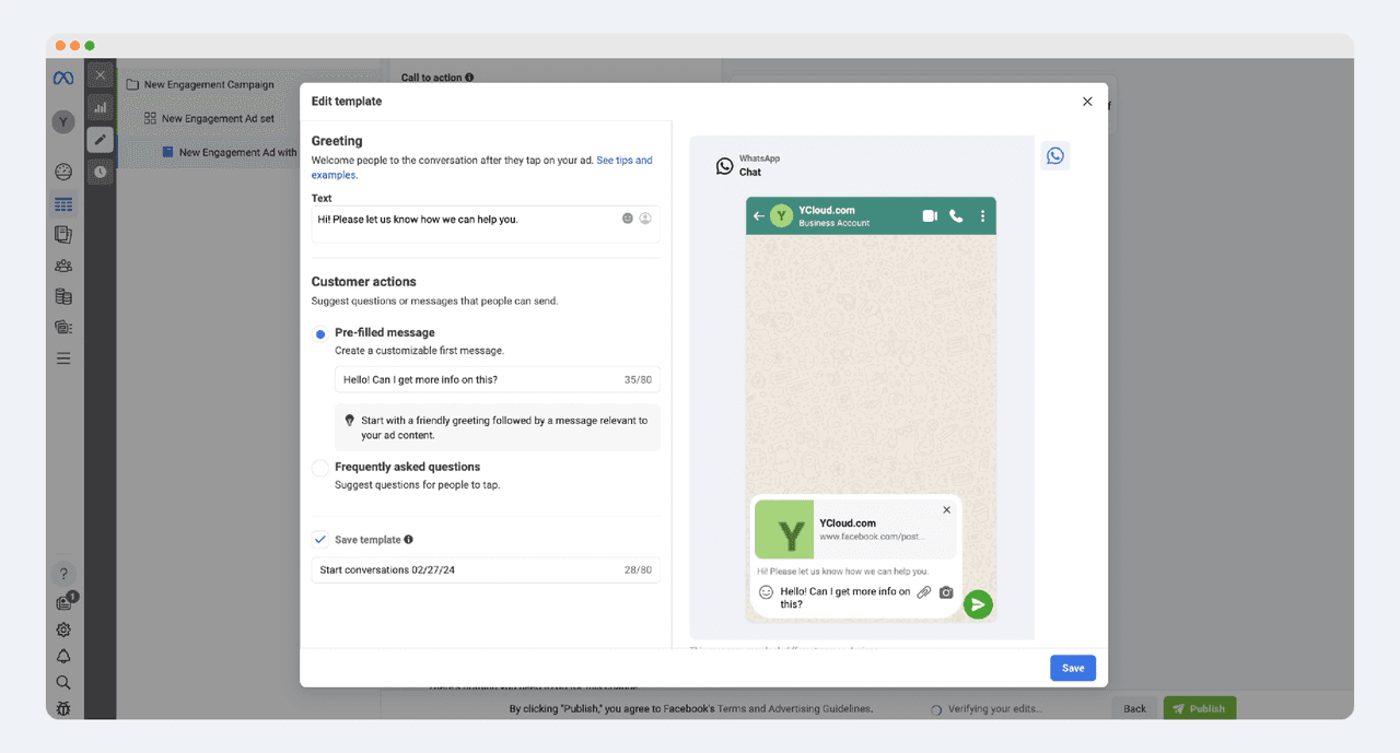 消息模板: 点击“新建”创建欢迎消息模板,以便用户点击广告后快速开启对话。