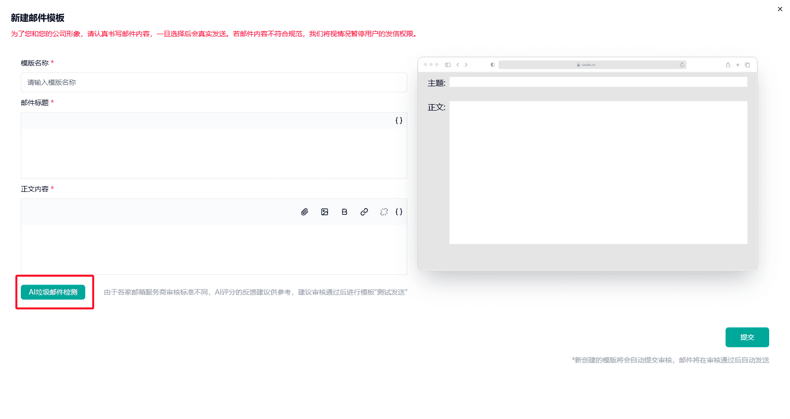 在新建邮件模板界面,信风AI特别设计了【AI垃圾邮件检测】功能。