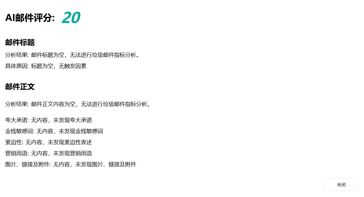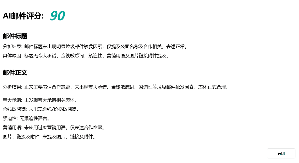 只需简单点击检测按钮,我们的智能算法就会立即对邮件标题和正文内容进行多维度分析评估,并给出1-100分的综合评分(分数越高代表邮件质量越优)。系统会从垃圾邮件触发规则、内容合规性、收件人互动可能性等多个专业角度进行全面诊断,并给出具体的优化建议。用户可以根据实时评分和详细分析报告,有针对性地调整邮件内容,显著提升邮件送达率和收件人打开率,让您的商务沟通更加高效可靠。