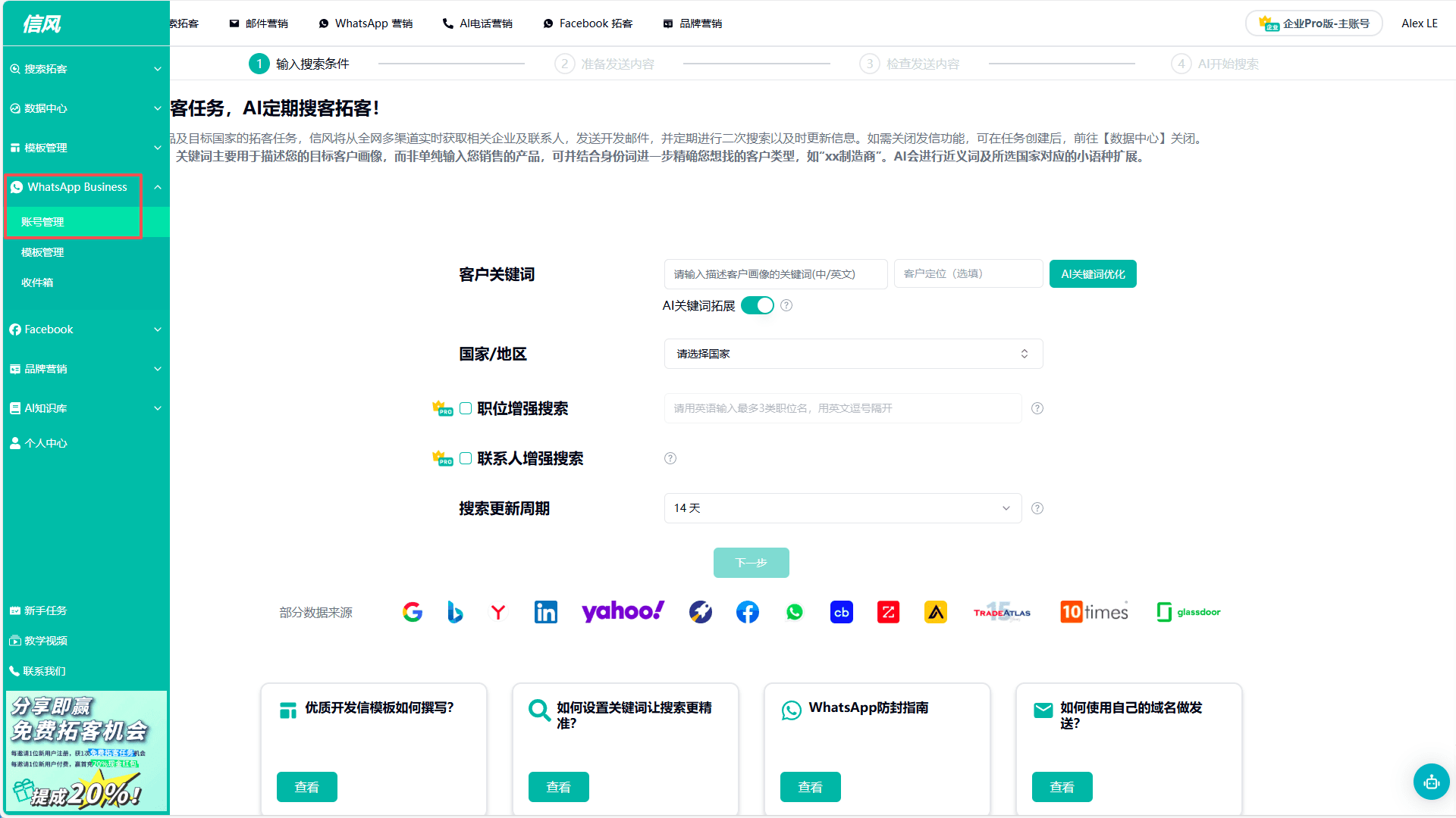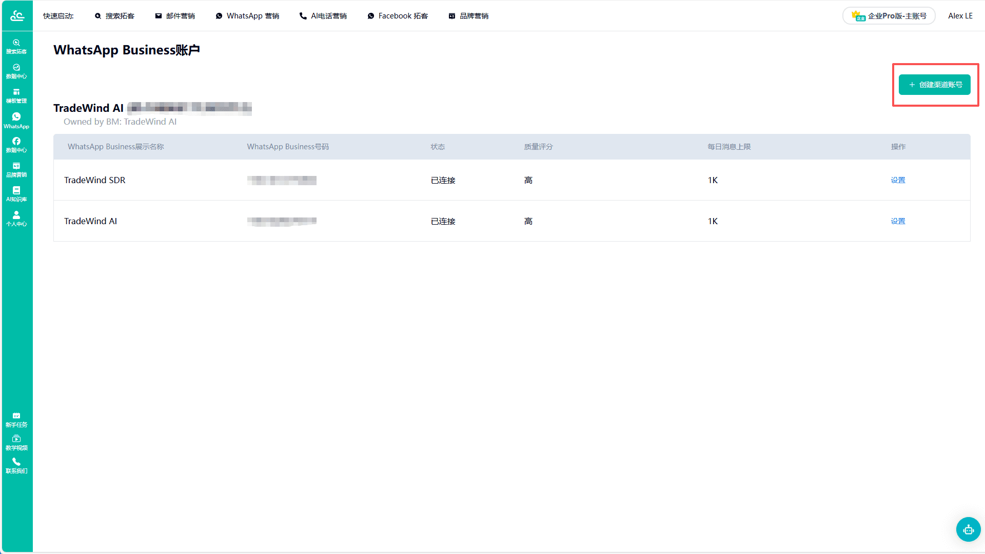 完成 TradeWind AI 的账号注册后,您即可在首页创建 WhatsApp 账号。