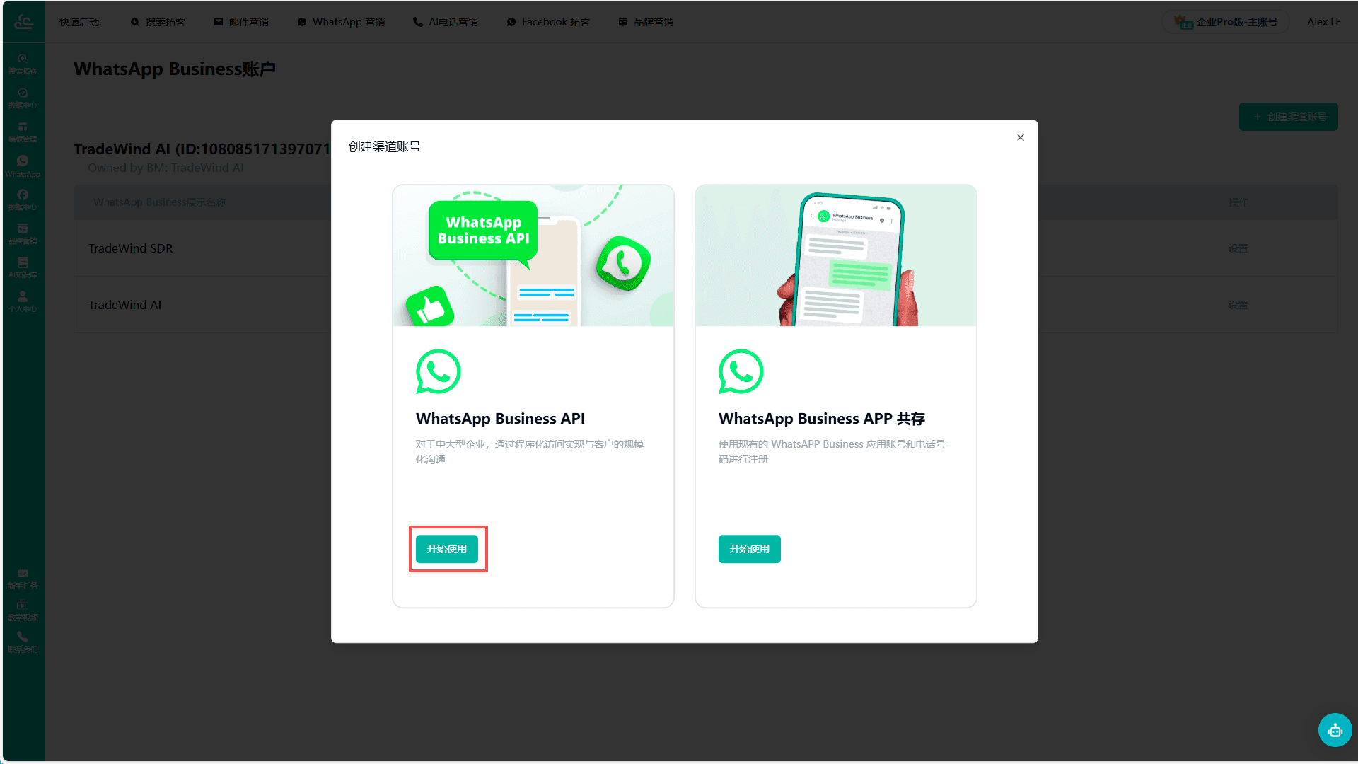 点击左侧「WhatsApp Business API」的「开始使用」按钮。