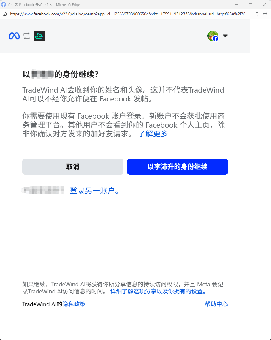 若账号不正确,可点击「登录另一账户」切换账号。确认无误后,点击「继续」进入下一步。