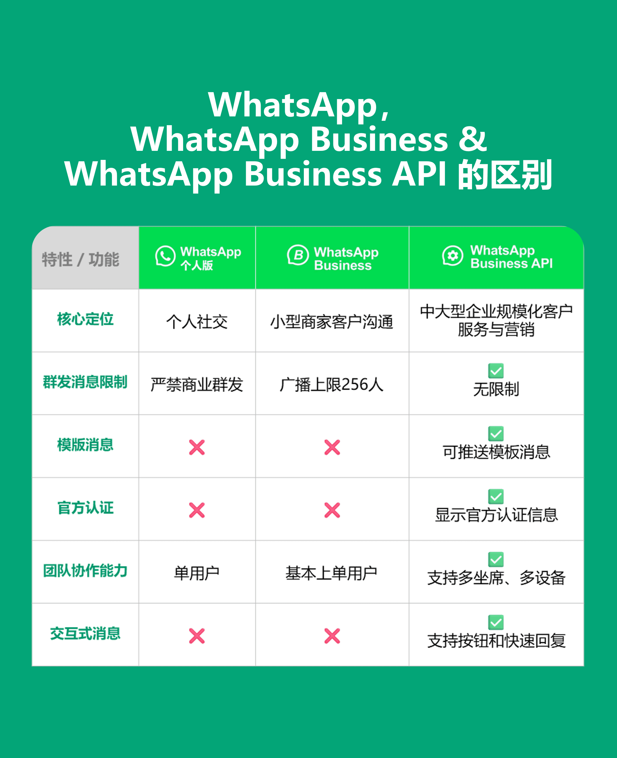 面向中大型企业,通过 API 方式接入,因此也常被称为 “WhatsApp API 账号”。企业可通过 WABA 创建一个或多个 WhatsApp 商业账户,支持批量发送消息、设置自动回复或构建 WhatsApp 聊天机器人等功能。